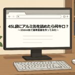 パソコンのモニターに“45L袋にアルミ缶を詰めたら何キロ?〜350ml缶で基準重量を作ってみた〜”と表示されたアイキャッチ画像。